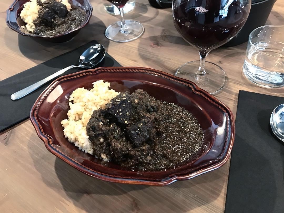 16種類のスパイスと玉ねぎ、ほうれん草、牛肉、赤ワインが入っている。お酒にも◎。また、小麦粉を使っておらず、お米も玄米なので夜食など〆に食べても気にしなくてイイのが良い。