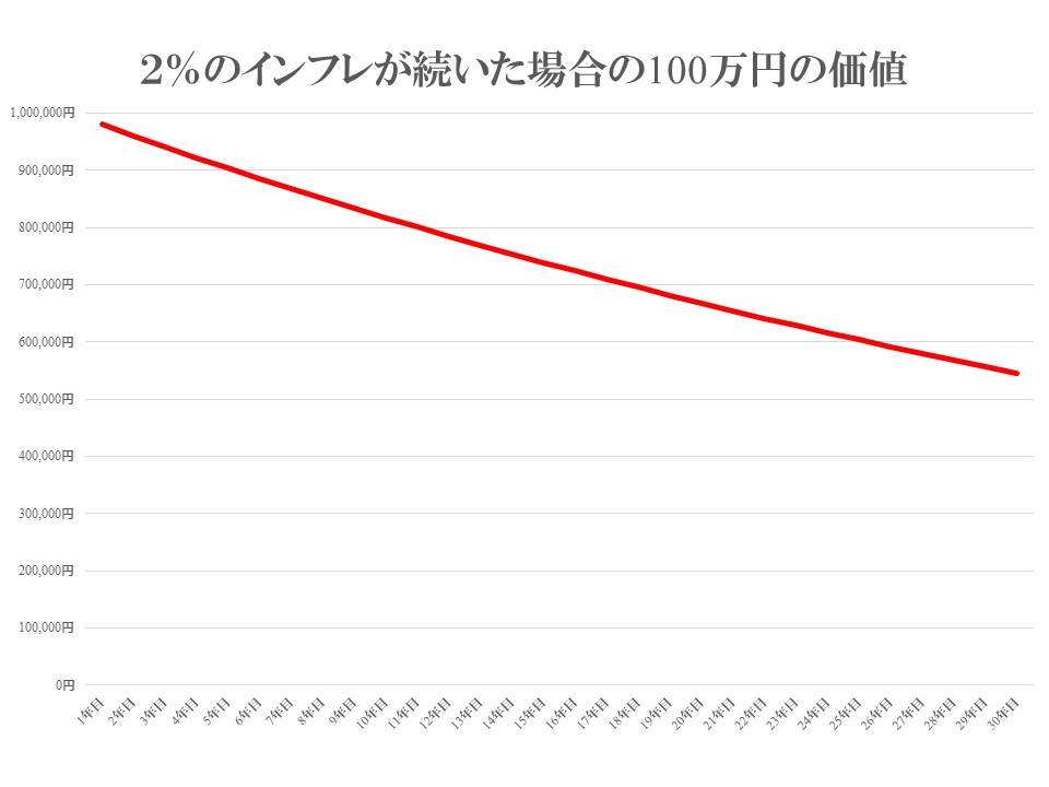 現在、日銀は物価を上昇させ、経済を成長させるために量的・質的金融緩和を導入しております。カンタンにいうと、世の中にお金をばらまくことで、現金の価値が減少し、物価が上昇させるいうことです。つまり、銀行に預金をしていたり現金でお金を持っていたりすると、相対的にその価値は薄れてしまいます。上の図は、2%ずつインフレが続いた場合のシミュレーションです。30年後には現在の100万円の貨幣価値が約半分程度になります。