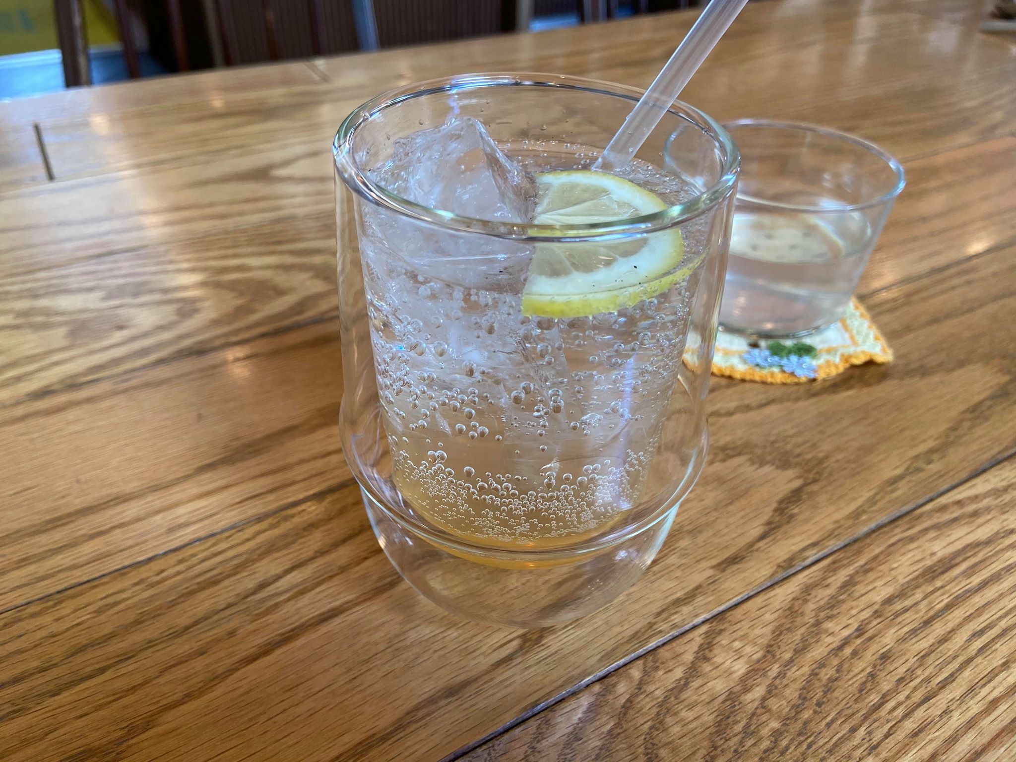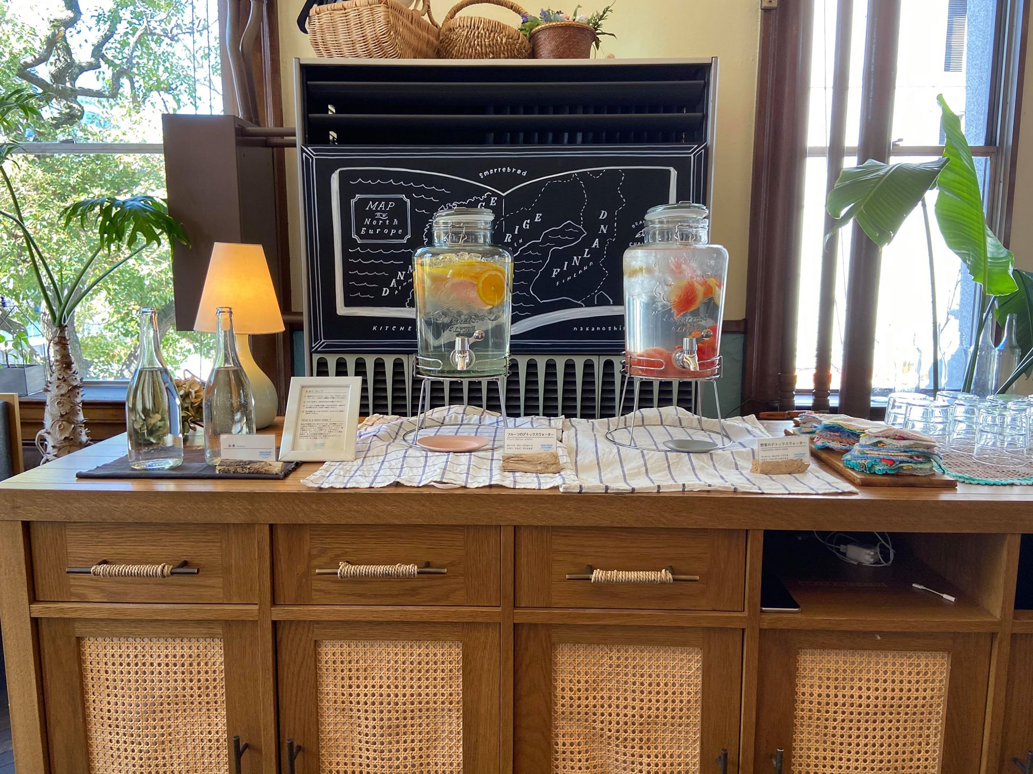 お水はセルフ式ではあるが、常温のお水の他にフルーツと野菜のデトックスウォーターが用意されている。どちらも美味しい。隣には可愛い手作りコースターも。このコースターは販売もしているので、ちょっとしたプレゼントにも良いかも。