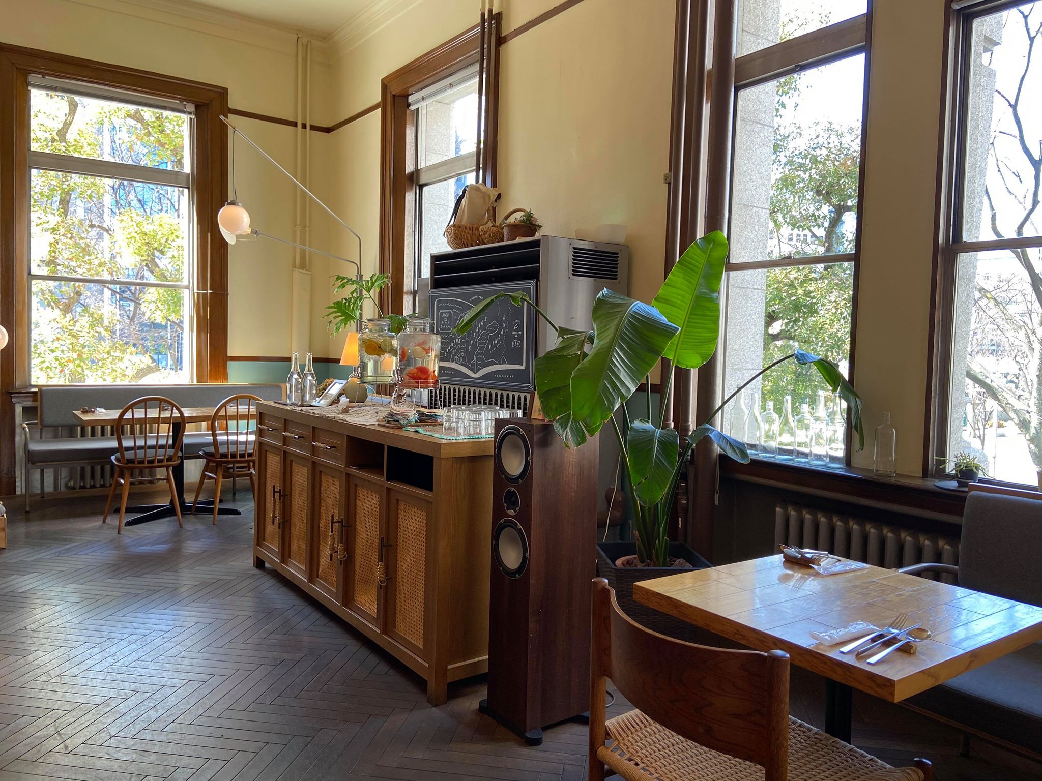 大阪府立中之島図書館の二階という最高の場所、歴史的建造物の中に入る「スモーブローキッチン 中之島」は、もともと府のコンペで勝ち取ったとのこと。高い天井に大きくて開放的な窓、以前ここは図書館の書庫だったそうだ。床やネジといった細かい部分にまで北欧デザインを取り入れている。椅子やテーブルも全て北欧スタイルに合うようにオーダーされた。ナイフやフォークを置くレストも店内の家具に合わせて木製のものをチョイスしているとのこと。