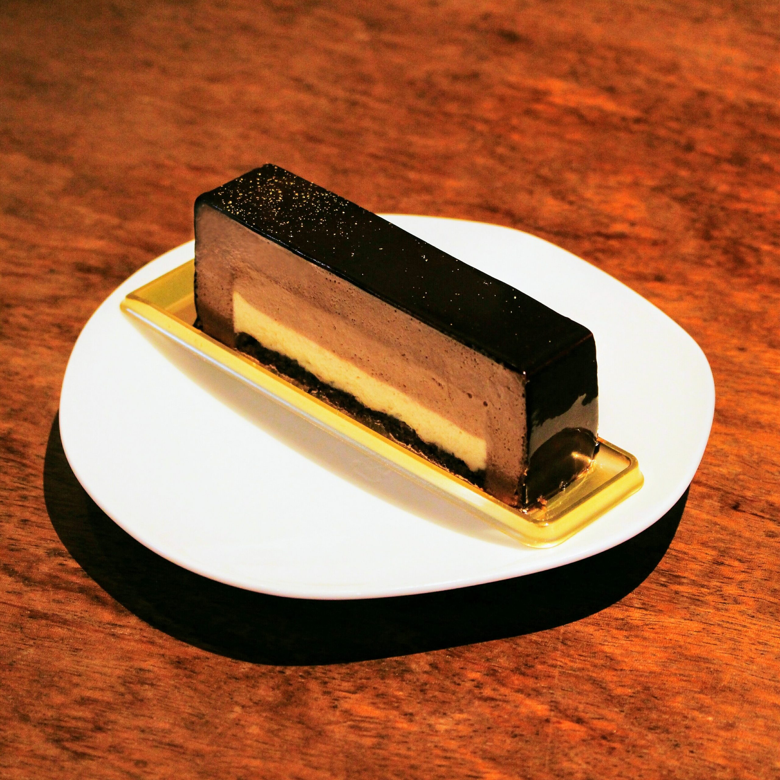 ホワイト(ローストしたカカオ豆で味と香をつけて)、ダーク、ミルクのムースの3種類のチョコレートを使ったケーキ。フワッフワで柔らかくて口の中で溶けていきます。甘みと苦みが程よくバランスが取れていて本当においしい。